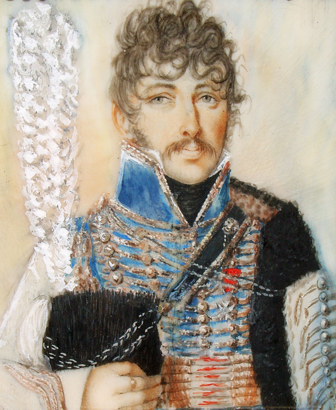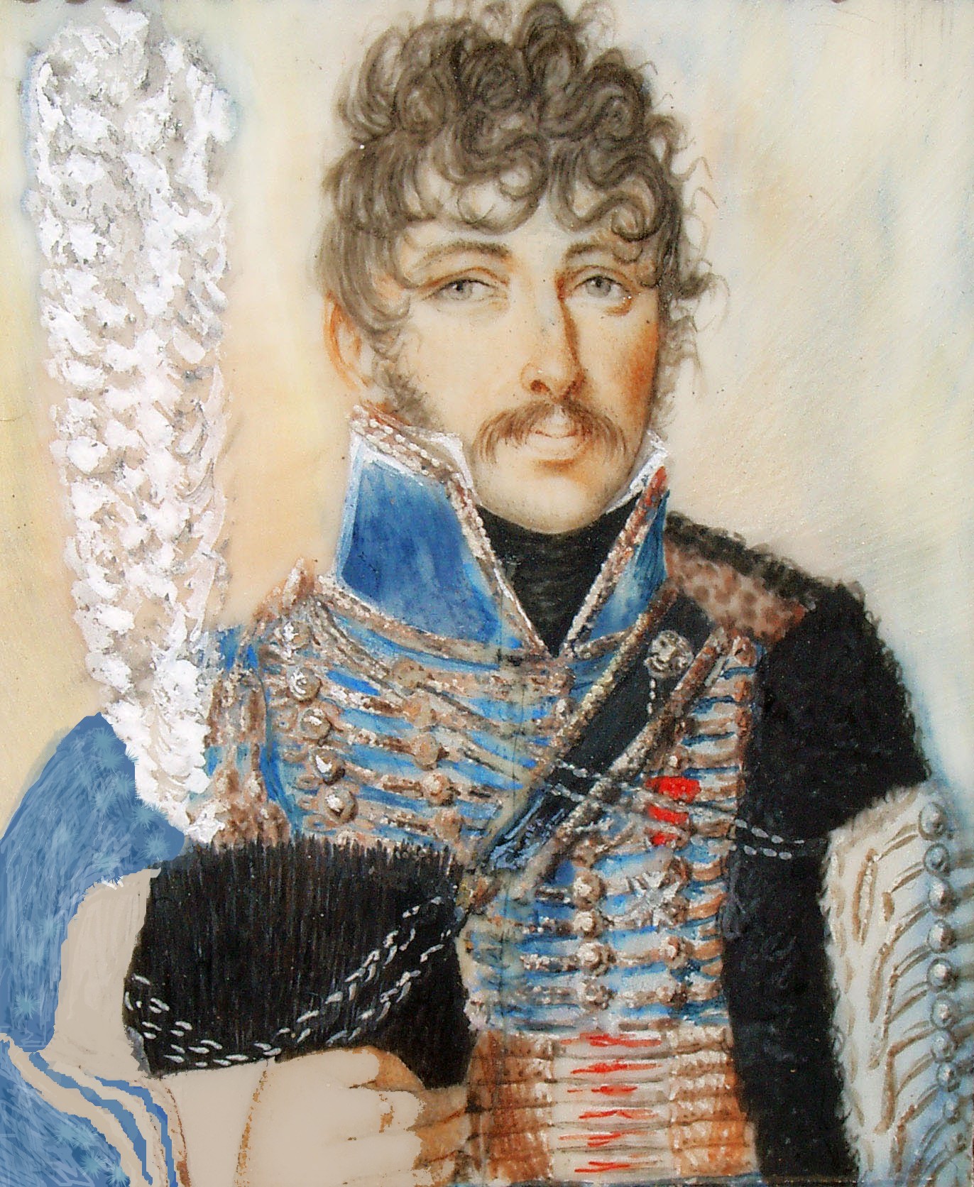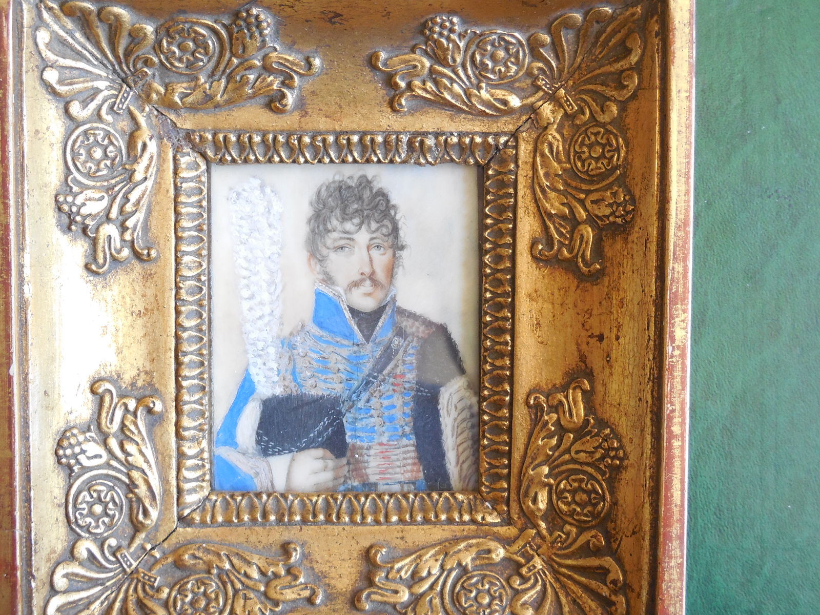 Miniature sur ivoire appartenant à la famille des barons de MOFFARTS et du SAINT-EMPIRE (Belgique) : il en existe plusieurs exemplaires, avec des légères différences sur la représentation de la banderole de la giberne et surtout la peinture du bras droit